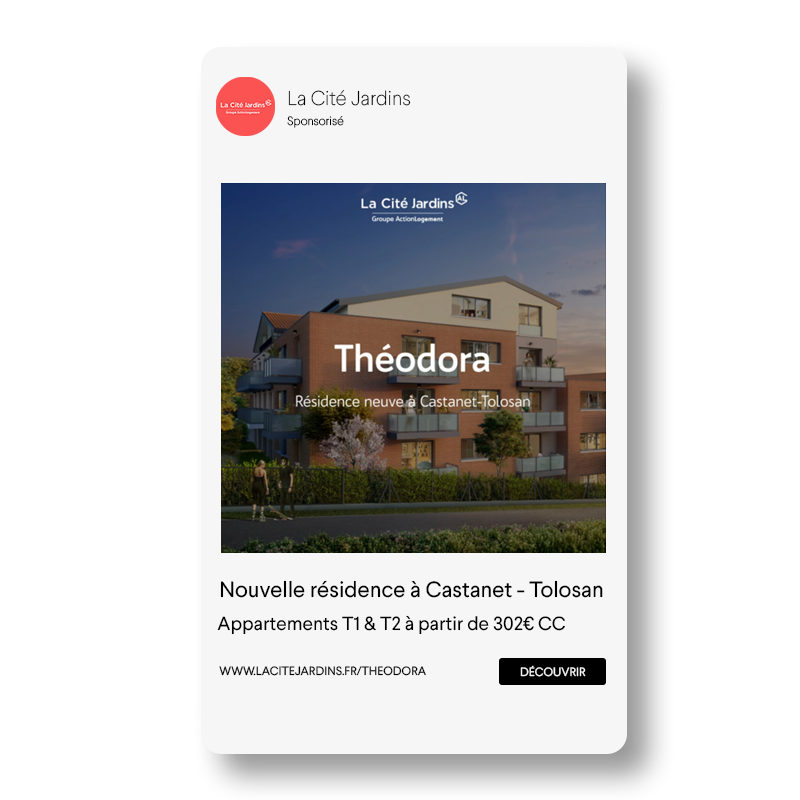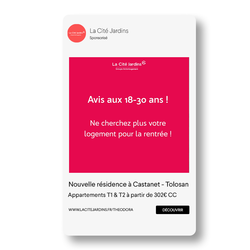 Pour mettre toute la puissance des réseaux sociaux au service de notre partenaire, nous avons également proposé à La Cité Jardins de promouvoir certaines opérations de location d’appartements grâce aux Social Media Ads et plus particulièrement via Facebook Ads. Nous avons alors travaillé des campagnes de publicités digitales locales en ciblant précisément la tranche d’âge visée par le logement.